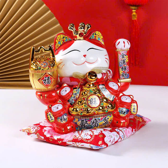 Mèo Thần Tài Vẫy Tay Đế Vương Đỏ nổi bật với sắc đỏ rực rỡ gam màu chủ đạo tượng trưng cho sự may mắn, sức khỏe và thịnh vượng trong phong thủy. Thiết kế đặc biệt gây ấn tượng mạnh với vương miện quyền lực, tay vẫy liên tục thu hút tài lộc, cùng với nhiều chi tiết tinh xảo như mèo con, túi vàng, thúng tiền.